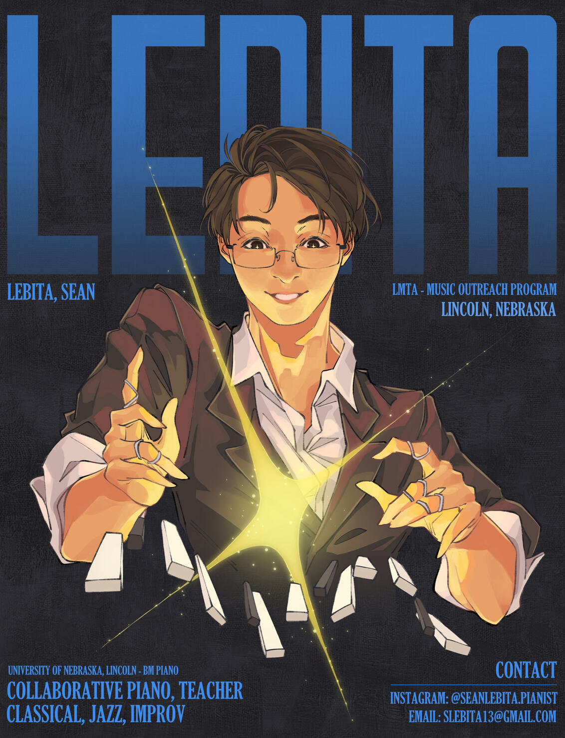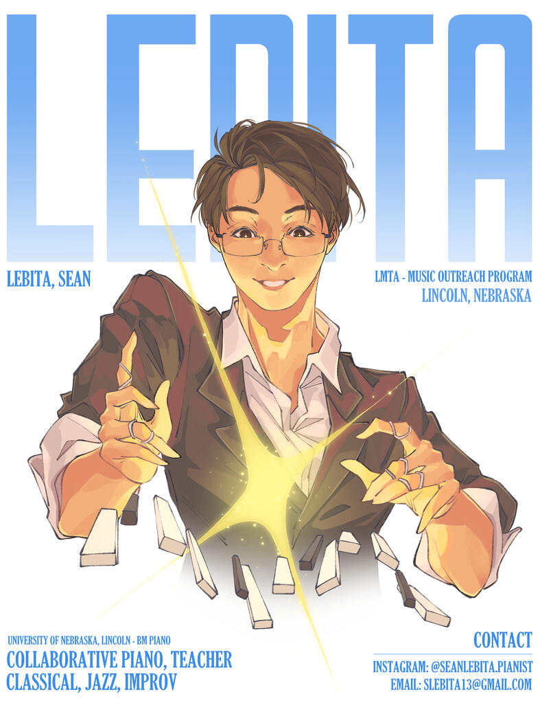 Sean Lebita is a collaborative and jazz pianist from Nebraska, but currently based in Michigan. He is pursuing a master’s degree in jazz studies as a graduate teaching assistant at Michigan State University, studying with esteemed pianist Xavier Davis. He is known for his energetic and passion filled performances which made him a highly sought after musician all across Nebraska, and is making a breakthrough in the Eastern Michigan scene. In Nebraska, he has performed many times in Lincoln’s coveted venue, the Lied Center for Performing Arts, as well as made appearances with the Omaha Symphony. Sean’s diverse set of skills allow him to be a jazz and classical pianist, accompanist, and chamber musician. Sean graduated magna cum laude with a BM in Piano Performance from the University of Nebraska-Lincoln, studying under Dr. Paul Barnes. While there, he won the Nebraska MTNA Young Artist competition for piano in 2018. He was also selected for the Glenn Korff School of Music Distinguished Undergraduate Artist/Scholar award in 2021. As a bandleader, Sean leads his own groups, the Sean Lebita Quartet/Quintet. In 2024, the Sean Lebita Quintet recorded his debut album, "Rose Tinted Glasses", a six-track collection of his own composition and arrangements. He also plays keys for the Nebraska Vocal Jazz Project, Bird Watching, Prism Trio, and is an in demand sideman for various musicians and genres around the Nebraska and Michigan area.In addition to performing, Sean takes great pride as an educator. At Michigan State, Sean teaches multiple jazz piano lab classes as well as private lessons. He was also selected to be a teaching assistant for the Brevard Jazz Institute in 2024 and 2025. He has also been teaching for his own private studio since 2019. In 2022-2024, Sean worked at Lincoln Northeast High School as a collaborative pianist and show band director, and frequently taught and assisted the choirs. He was also selected to be a TA for the Brevard Jazz Institute in 2024 and 2025. He also helps clinic high school jazz bands in the Lincoln area, notably being one of the first clinicians with the Ursus Jazz Festival at Standing Bear High School, as well as helping with collegiate chamber musician coaching. He also collaborates with many pianists online, giving lectures and masterclasses, along with hosting online recitals.In his free time, Sean is a huge Pokemon nerd, enjoys coffee shops, speedsolves 3x3 Rubik's cubes (he averages 12 seconds), and plays card games. His favorite band is Jukebox the Ghost, and he loves the color pink.